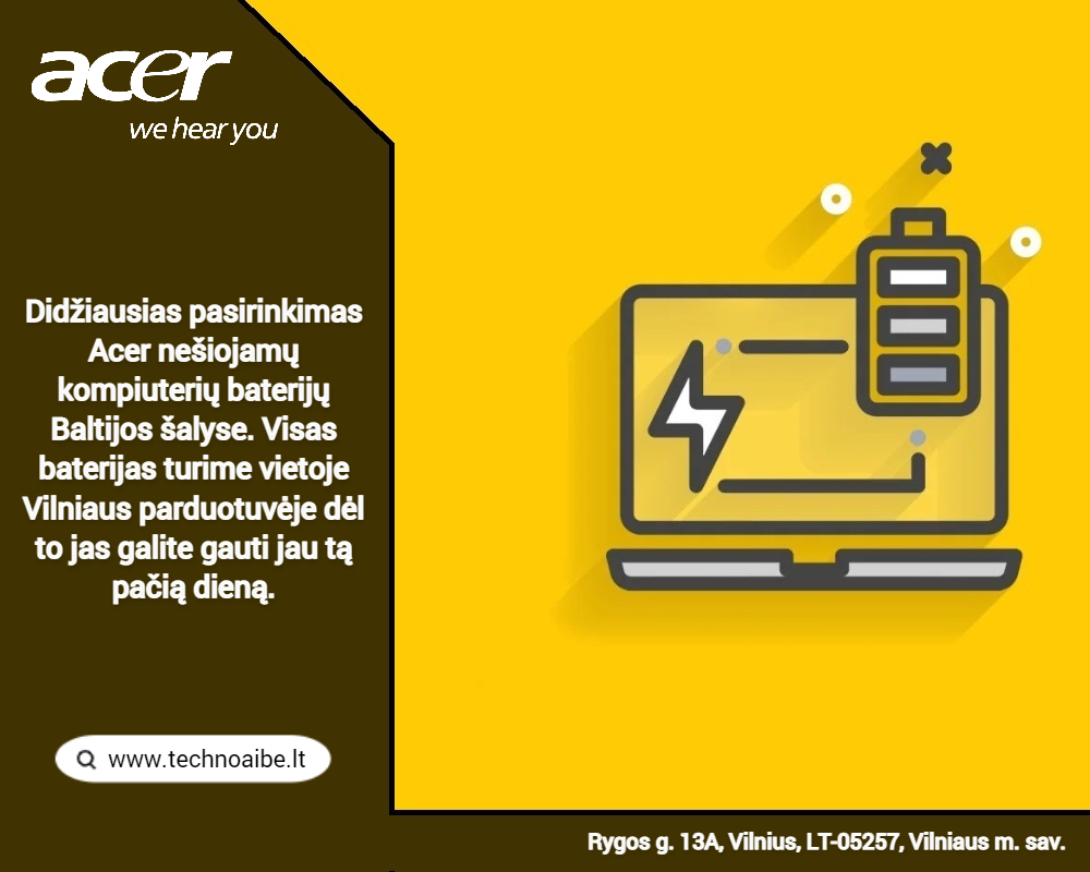 Acer nešiojamieji kompiuteriai turi ličio jonų akumuliatorių, nauja baterija užtikrina, kad nešiojamasis kompiuteris gali veikti kelias valandas. Tačiau laikui bėgant nešiojamojo kompiuterio akumuliatoriai ištuštins ir kompiuterio darbo laikas bus žymiai sutrumpintas arba akumuliatorius visiškai atsisako paklusti ir turėtų būti pakeistas nauju. Pas mus didžiausias pasirinkimas Acer nešiojamų kompiuterių baterijų Baltijos šalyse. Visas baterijas turime vietoje Vilniaus parduotuvėje dėl to jas galite gauti jau tą pačią dieną. Mes importuojame nešiojamų kompiuterių baterijas tiesiai iš gamintojų. Bendradarbiaujame su visais pagrindiniais kompiuterių gamintojais. Parduodame tiek originalius akumuliatorius, tiek aukštos kokybės pakaitalus pagamintus pagal mūsų specialius reikalavimus.