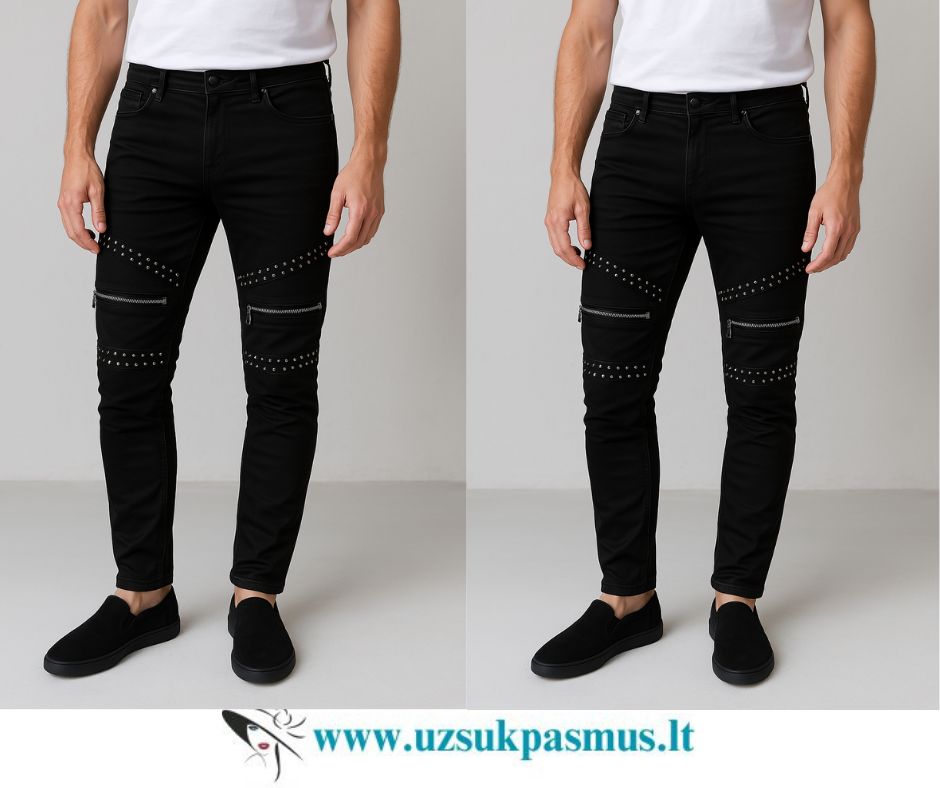 Išsiskirkite su šiais stilingais jaunatviškais vyriškais džinsais, kurie puikiai atspindi modernią ir drąsią madą. Šie siaurėjantys juodi džinsai išsiskiria unikaliu dizainu, papuoštu skersais užtrauktukais ir metalinėmis spaudėmis abiejose kojų pusėse. Nuo 28 iki 38 d. Šiuos ir kitus modelius rasite uzsukpasmus