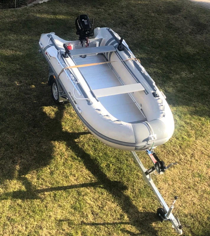 *Elling F310, lengva, motorinė valtis (310×145), tik 33 kg., dugnas lentelės, pilka, leistinas keleivių ir bagažo svoris 450 kg., para -15 eurų.